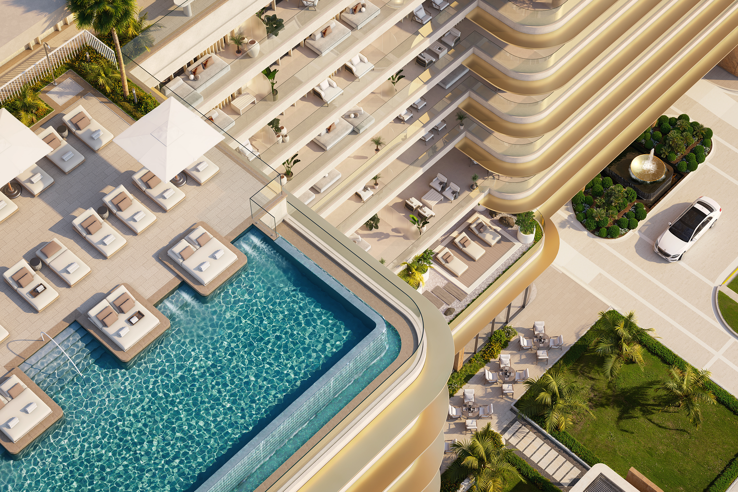 Soléva Beach Residences is a luxury coastal retreat where organic forms, elegant minimalism, and high-end materiality come together to create an elevated beachfront living experience. Inspired by the sandy earth tones and fluid lines of Al Marjan Island’s beaches, the design consists of four sculpted vertical volumes that form a playful yet refined skyline. These volumes feature subtly rounded edges, as if eroded and sculpted by the sea breeze, reinforcing the organic connection to their surroundings.